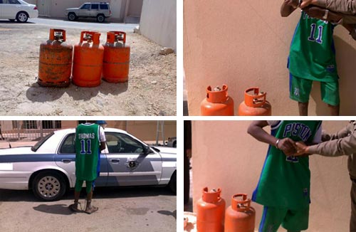 أطاحت فرق دوريات الأمن بمنطقة الرياض صباح أمس بجانٍ قام بالقفز على عدة منازل خلال 35 دقيقة وسرقة محتويات معينة تمثلت في براميل الغاز. وتعود تفاصيل الحادثة عندما كان أحد الأحياء في غرب مدينة الرياض هادئاً وكانت الساعة تقترب من العاشرة صباحاً تستعد ربات المنازل لاستقبال أطفالهن العائدين من المدارس وتحضير وجبة خفيفة قبل وجبة الغداء الرئيسية وفي تلك الأثناء لاحظت إحدى ربات المنازل اختفاء برميل الغاز من منزلها فتيقنت أن هناك لصاً دخل المنزل.