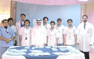 انطلقت الحملة التوعوية بأورام القولون والمستقيم والتي يقوم عليها وينظمها فريق الجراحة بمشروع التثقيف الصحي المقام بالتعاون بين مركز التثقيف الصحي بكلية الطب والمستشفيات الجامعية بجامعة الملك سعود وبرنامج الشراكة الطلابية بالجامعة أولى حملاتها التفاعلية في مستشفى الملك خالد الجامعي، بحضور أ.د. مساعد بن محمد السلمان عميد كلية الطب والمشرف على المستشفيات الجامعية، التي قام بتدشين الحملات التفاعلية، بحضور المشرفين على الحملة من استشاريي كلية الطب والمستشفيات الجامعية والطلاب القائمين عليها. وشمل الركن المعد خصيصا لهذه الحملة على مطويات تعريفية بالمرض وعوامل خطورته وطرق ووسائل الكشف المبكر عنه الخيارات العلاجية المتاحة للمرضى وكذلك هدايا تذكارية للزوار.