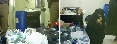 جاء ذلك بعد توافر معلومات لدى قوة المهمات والواجبات الخاصة عن قيام وافدة من جنسية إفريقية بإعداد شقتها معملاً لتصنيع الخمور وترويجها وبيعها على صغار السن والمراهقين وعلى العمالة بحي الشميسي. وعلى ضوء هذه المعلومات تمت مراقبة هذه الوافدة ومتابعة تحركاتها، وقد أظهرت التحريات كثرة تردد الأحداث والعمالة على شقتها بأوقات مختلفة؛ فتم إعداد كمين أمني مُحْكم تحقق من خلاله ضبطها متلبسة أثناء قيامها ببيع إحدى قوارير العرق المسكر. وقد عثر بداخل شقتها على مصنع متكامل لصناعة مادة العرق المسكر؛ حيث عثر على عدد برميلين كبيرين، سعة البرميل مائتان وخمسون لترا مليئة بالخمر، وعدد ثلاثة براميل سعة البرميل مائة لتر مملوءة بالمسكر، وعلى عدد ثلاثة براميل سعة البرميل خمسة وعشرون لترا ممتلئة، وعلى عدد ثمانية وأربعين قارورة كبيرة جميعها مملوءة بالمسكر وجاهزة للترويج والبيع، وعلى عدد قدر ضغط واحد وأسطوانة غازية. وبمناقشتها اعترفت بأنها تمتهن تصنيع الخمور وترويجها داخل شقتها. تم تسليم المقبوض عليها وفق ما ضُبط لديها لجهة الاختصاص بمركز شرطة الديرة لاتخاذ اللازم بحقها.