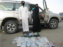 تمكَّنت دورية حرس الحدود بقطاع الموسم بجازان من القبض على شقيقين أحدهما بزي نسائي حينما اشتبهت في سيارة نوع جيب لاند كروزر موديل 98؛ فتم طلب استيقافها، إلا أن قائدها زاد من سرعته؛ فتمت ملاحقته وإطلاق طلقات تحذيرية لإيقافه؛ فاصطدم بحاجز خرساني وأوقف السيارة؛ فتمت محاصرته من قِبل الدورية والقبض عليه، وبتفتيش السيارة وجد بها سائق سعودي الجنسية يبلغ من العمر 26 عاما وامرأة ترافقه، لكن كانت المرأة في وضع مشكوك فيه؛ فتبين أنه شاب يبلغ مع العمر 19 عاما يتنكر بزي وحجاب امرأة، وبتفتيش السيارة وجد بداخلها حقيبة بها عدد (39 بلاطة حشيش)؛ فتم اقتيادهما والسيارة والمضبوطات لقيادة قطاع الموسم للتحقيق، وتبين أن السائق والمرافق إخوان حسب بطاقة الأحوال؛ فجرى تطبيق النظام بحقهما.