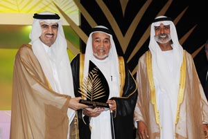 تحت رعاية صاحب السمو الشيخ خليفة بن زايد آل نهيان رئيس دولة الإمارات العربية المتحدة سلّم معالي الشيخ نهيان بن مبارك آل نهيان وزير التعليم العالي والبحث العلمي رئيس مجلس أمناء جائزة خليفة الدولية لنخيل التمور الأستاذ عبد السلام بن صالح الراجحي الأمين العام لإدارة أوقاف صالح عبدالعزيز الراجحي جائزة خليفة الدولية لنخيل التمر بمناسبة حصول مشروع الباطن التابع لإدارة الأوقاف بالمركز الأول في فئة المنتجين المتميزين في مجال زراعة النخيل وإنتاج التمور.