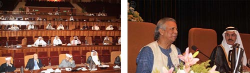 وأضاف الجاسر أن يونس أسس بنك غرامين في بنجلاديش الذي يقوم على مبادئ الثقة والتضامن ومساعدة الفقراء على مكافحة الفقر عن طريق تعليمهم المبادئ المالية السليمة حتى يتمكنوا من مساعدة أنفسهم وتقديم قروض بشروط مناسبة لهم لافتاً إلى أن معدل استرداد القروض لدى بنك غرامين قد يتجاوز 98 بالمائة من إجمالي القروض المقدمة وتعتبر هذه النسبة أعلى نسب الاسترداد في العالم. وأبان معالي محافظ مؤسسة النقد العربي السعودي أن الدكتور يونس حاز على جائزة نوبل للسلام لعام 2006م إضافة إلى العديد من الجوائز الدولية ومن أهمها جائزة يوم الاستقلال عام 1987م وهي أعلى جائزة في بنجلاديش وجائزة آغا للعمارة في عام 1989م من سويسرا.