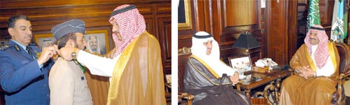 تنفيذاً لأمر خادم الحرمين الشريفين القائد الأعلى لكافة القوات العسكرية الملك عبدالله بن عبدالعزيز آل سعود، قلد صاحب السمو الملكي الأمير خالد بن سلطان بن عبدالعزيز مساعد وزير الدفاع والطيران والمفتش العام للشؤون العسكرية، في مكتبه بالمعذر أمس، قائد سلاح الجو السلطاني العماني اللواء الطيار الركن يحيى بن رشيد آل جمعة، وسام الملك عبدالعزيز من الدرجة الأولى؛ تقديراً لجهوده في توطيد عرى الصداقة والتعاون بين القوات الجوية في البلدين.