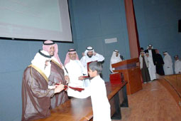 سلَّم محافظ القريات عبد الله الجاسر جوائز مسابقة: (ملك وولاء مواطن) التي أطلقها قسم التوجيه والإرشاد.. واستهدف جميع طلاب مدارس القريات ابتداء من الصف الرابع الابتدائي.. وحتى الثالث الثانوي.. وقد بدأ الحفل الذي أُقيم بصالة النشاط الثقافي بمبنى إدارة التربية والتعليم للبنين بآيات من الذكر الحكيم.. ثم كلمة رئيس قسم التوجيه والإرشاد التي بيَّن من خلالها بأن عدد الرسائل التي وصلت للجنة بلغ أكثر من 2000 رسالة تميز منها 35 رسالة.. وأن المسابقة تهدف إلى تعزيز قيمة حب الوطن والولاء لولاة الأمر لدى منسوبي المجتمع المدرسي، تلا ذلك كلمة مدير التربية والتعليم سليمان المنيع الذي رحب من خلالها بالمحافظ وصحبه الكرام.. وأثنى على الدور الريادي الذي يُقدم للطلبة عن طريق معلميهم ومديري المدارس من خلال المناشط المتعددة والإرشاد الطلابي، بعد ذلك تفضل محافظ القريات بتسليم الطلبة المتميزين جوائزهم.