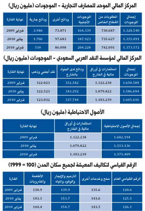 كشف التقرير الأخير لمؤسسة النقد العربي السعودي عن استمرار الرقم القياسي لتكاليف المعيشة بالصعود خلال شهر فبراير بما يقارب 0.60 نقطة ليلامس مستوى 126.1مسجلا بذلك ارتفاعا مقارنة بفبراير من العام الماضي يتجاوز 4.5% ويأتي هذا التغير مشفوعا باستمرار ارتفاع الرقم القياسي للأطعمة والمشروبات وكذلك الترميم والإيجار مقارنة بشهر يناير الماضي. أما السلع والخدمات التي سجلت تراجعاً عن فبراير من العام الماضي فهي الأقمشة والملابس وكذلك النقل والاتصالات، أوضحت البيانات الواردة بالتقرير عن تحسن مستوى الإقراض لدى البنوك المحلية بارتفاعها خلال فبراير بما يقارب 3.74مليارات ريال وقد تركزت الارتفاعات في المدى القصير وكذلك في المدى الطويل كما كشف التقرير عن تحسن مستوى إقراض البنوك للقطاع الخاص بواقع 0.8% عن شهر يناير وبنسبة 1.5% عن فبراير من العام الماضي.