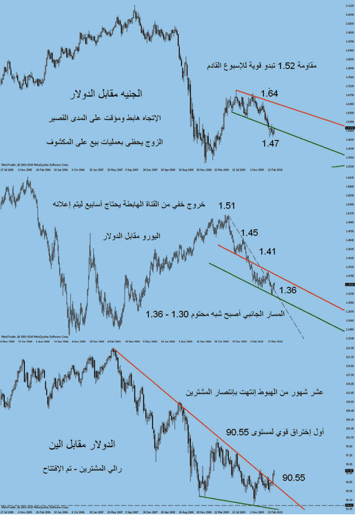 الاتجاه لا يزال هابطاً لكن هناك تحول للمسار الجانبي بشكل خفي موضح بخط الاتجاه المنقط لا سيما وأن صفقات البيع بدأت تخف عزومها ومستوى 1.36 مقاومة قوية للأسبوع القادم ويرجح تذبذب الزوج بين 1.30 و 1.36 على المدى المتوسط.