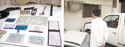 جاء ت عملية القبض عندما اشتبهت الفرقة بشخص في العقد الرابع من العمر يقود سيارة داتسون غمارة اللون أبيض، وعند ملاحظته لوجود الفرقة على مقربة منه حاول الهروب فتمت متابعته والسيطرة عليه خلف أسواق اللحوم بحي المرقب وعند مناقشته تبين أن كلامه متناقض، والرجوع إلى نظام المعلومات للتأكد من بيانات السيارة اتضح أنها مسروقة، ووجد بحوزة الشخص سلاح من نوع مسدس جي لوك وخزنة بها ثمان عشرة طلقة من الذخيرة الحية، كما وجد معه أربع بطاقات مزورة برتب عسكرية مختلفة وفي عدة قطاعات منها حرس الحدود ومكافحة المخدرات كما وجد مع الشخص رخص سير سيارات أخرى مختلفة.