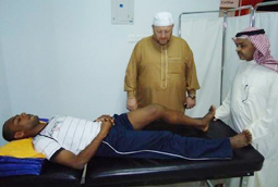 ورافق الدكتور خلال معاينة بعض المصابين الذي يعانون من إصابات الملاعب وأمراض العظام مساعده الدكتور أسامة وكذلك الدكتور خريف الخريف أخصائي العلاج الطبيعي في مستشفى الملك فهد التخصصي ببريدة والمشرف العام على الجهاز الطبي في نادي التعاون.