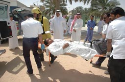 نفذت مدرسة خالد بن الوليد المتوسطة بالمبرز صباح أمس السبت خطة إخلاء وهمية ناجحة إثر احتراق مختبر المدرسة مما نتج عنه إصابة طالبين إثر تفاعل عدد من المواد الكيماوية أثناء قيام محضر المختبر ومعلم العلوم بتنفيذ عدد من التجارب العلمية في المدرسة، وفور تلقي غرفة العمليات بالدفاع المدني للبلاغ سارعت فرقة مركز المبرز بقيادة الملازم فهد الشريف، والرقيب حسين العلوي إلى موقع الحريق، فيما سارعت فرقتان من الهلال الأحمر بقيادة رئيس قسم الطوارئ محمد بن راشد الحمد و المسعفين صادق بن طاهر الحاجي وعبدالله بن محمد الزعبي لعمل الإسعافات اللازمة للمصابين في هذا الحريق. وكانت إدارة المدرسة ممثلة في مديرها سمير بن صالح الملحم، ورائد النشاط خالد بن راشد الحمد وجميع المعلمين قد استطاعوا إخلاء جميع طلاب المدرسة والبالغ عددهم 400 طالب من الفصول وإخراجهم إلى الساحة الخارجية.