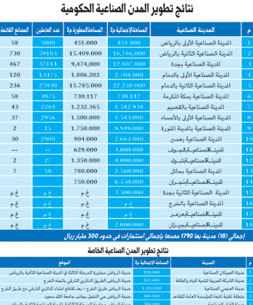 وتطرق الوزير إلى المشاريع التي تمت خلال السنتين الأخيرتين لتطوير مدن صناعية جديدة مثل: جدة الثانية، الخرج، عرعر، جازان، توسعة الدمام الثانية، وتوسعة المدينة المنورة، وهذه الزيادة في المساحة المطورة خلال سنتين تعادل 60% من مساحة المدن القائمة.