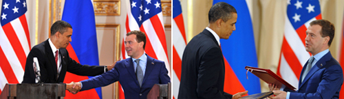 وقع الرئيسان الأمريكي باراك أوباما والروسي ديمتري مدفيديف أمس الخميس في براغ معاهدة ستارت الجديدة للحد من الأسلحة النووية التي تنص على تخفيض كبير في ترسانة البلدين. ووقع الرئيسان بالأحرف الأولى في القاعة الإسبانية الفخمة من قصر براغ المعاهدة التي تم التوصل إليها بعد مفاوضات
