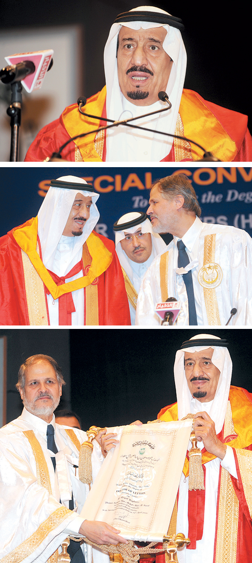 نال صاحب السمو الملكي الأمير سلمان بن عبدالعزيز أمير منطقة الرياض أمس شهادة الدكتوراه الفخرية من الجامعة الملية الإسلامية في حفل خاص بمقر الجامعة في دلهي ضمن زيارته الحالية لجمهورية الهند.