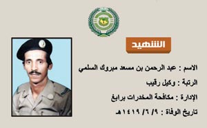 سجل الوكيل الرقيب عبدالرحمن بن مسعد بن مبروك السلمي من إدارة مكافحة المخدرات في محافظة رابغ اسمه ضمن الشهداء بعد أن لقي وجه ربه في 9-6-1419هـ إثر مواجهة مسلحة مع مروج مخدرات.