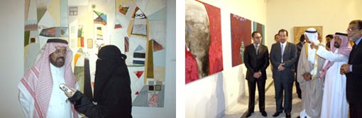 ضمن الحشود الكبيرة وغير المتوقعة لمعرض إبداعات سعودية المقام بقصر الفنون بأرض الأوبرا بالقاهرة الذي يستمر حتى 22 أبريل بمشاركة 24 فناناً سعودياً وبرعاية وزير الثقافة فاروق حسني وسفير خادم الحرمين الشريفين بمصر هشام محي الدين ناظر وأثناء جولة بالمعرض من قبل النقاد وجمهور الفن التشكيلي صرح الملحق الثقافي بالملحقية الثقافية السعودية بالقاهرة المستشار محمد عبدالعزيز العقيل الذي حضر نيابة عن معالي السفير هشام محي الدين ناظر ل(الجزيرة) قائلاً: تعتبر العلاقة الفنية الحميمة بين المملكة ومصر هي علاقة متميزة على أعلى المستويات وما هذا المعرض إلا أحد هذه التجليات التي نعيشها اليوم بين البلدين وهذا التجمع المتميز الذي يعتبر من أهم وأكبر المعارض التشكيلية هو دليل النمو الواضح لعالم الفن التشكيلي إضافة إلى أننا نشكر الإخوة الذين أتاحوا لنا هذه الفرصة كسعوديين والتي أعطت بحق تأكيداً صريحاً على أن المملكة العربية السعودية تعيش اليوم فترة مهمة وفترة متقدمة ومن أهمها هذا الفن، وهنا نشكر الذين صوروا لنا صورة متكاملة للفن التشكيلي السعودي بأن عيشونا في قرية جميلة أخذتنا بعوالم الفن الإبداعي السعودي، كما اقترح الملحق الثقافي على رئيس قطاع الفنون التشكيلية بمصر أن يصبح هذا المعرض ثابتاً سنوياً مشتركاً بين المملكة ومصر بحيث يضم أبرز الفنانين التشكيليين ليتم توسيع المشاركة على جميع المناطق ويتم التطلع عبره لثقافات المملكة المختلفة ويشكل مرآة للثقافة السعودية على أرض مصرية..