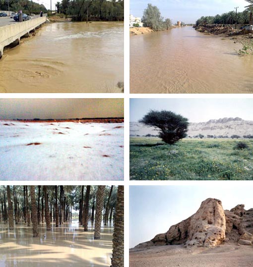 وقد سالت أودية العين والخبي وماوان وتمير ووثيلان وبعض شعبان العقيمي ووصلت مياه السيول إلى حقول النخيل في العذار والمحمدي فأصبحت الأحياء الزراعية بحيرات جميلة قصدها المتنزهون من جميع أنحاء المدينة.