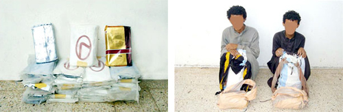 تمكنت الدوريات التابعة لحرس الحدود بمنطقة نجران من القبض على عدد من الأشخاص في موقعين مختلفين كانوا يحاولون تهريب مادة يشتبه أنها مادة الحشيش المخدر، وأوضح الناطق الإعلامي لحرس الحدود بمنطقة نجران النقيب حسن بن محمد العمري أنه تم القبض على عدد أربعة أشخاص كانوا يحالون تهريب مادة يشتبه أنها من الحشيش المخدر تزن ما مجموعه 65 كجم وعدد من أجهزة الجوال وشرائح اتصال سعودية ويمنية ومبالغ مالية بحوزتهم.