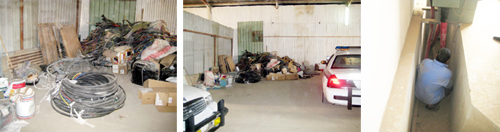 على الفور تم تحريك قوة من الفرقة الميدانية وانتقلت لموقع المستودع الذي بدا بابه مفتوحاً فتحاً بسيطاً وبالدخول للمستودع بدا خالياً من الأمام وذلك من خلال وضع حاجز لوضع الكيابل المسروقة خلفه ومباشرة الوزن والتقطيع فتم ضبط اثنين من العمالة الآسيوية وبحوزتهما كميات ضخمة من الكيابل الجديدة وكميات من كيابل النحاس الكهربائية تزن أكثر من طن ونصف الطن مقطعة جاهزة للبيع وبتفتيش المستودع وجدت 10 أكياس كبيرة بها كيابل أسلاك هاتف جديدة تم تقطيعها لاستخراج مادة النحاس منها كما ضبط خمسة أكياس من الحجم الكبير بها محابس ماء مصنوعة من مادة النحاس أيضا كما ضبط داخل المستودع ميزان من الحجم الكبير ومقصات حديد من النوع الكبير وأجهزة حرق الغلاف البلاستيكي للكيابل الكهربائية وغيرها كما وجد سقف المستودع مخرج للهرب أعده الجناة في حال انكشاف أمرهم وسلم على المخرج بطول ستة أمتار.