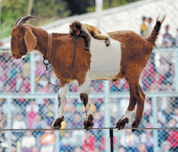 هذه ليست صورة مفبركة بل هي حقيقية لعنزة تمشي على خيط رفيع وعلى ظهرها قرد وكلاهما مدربان خلال عروض أقيمت أمس في الصين |