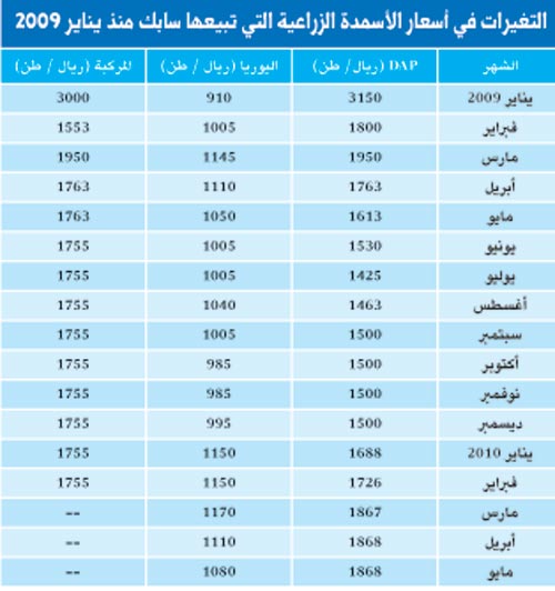 الجدول يوضح تغير أسعار الأسمدة في السوق السعودي منذ شهر يناير 2009: