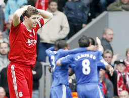 واصل فريق تشلسي الإنجليزي زحفه نحو لقب الدوري بعد أن كسب أمس ليفربول بهدفين دون مقابل في الجولة ما قبل الأخيرة من الدوري الإنجليزي الممتاز وتبقى للفريق الأزرق مباراة أخيرة على ملعبه وبين جماهيره أمام ويغان يتوج بعدها في حال فوزه بلقب الدوري دون النظر لنتائج ملاحقه فريق مانشستر يونايتد. سجل هدفي اللقاء كل من الايفواري ديديه دروجبا ولامبارد. الشوط الأول كان هادئاً في بدايته مع وجود سيطرة زرقاء واضحة على منتصف الملعب، وكاد لاعب ليفربول أكويلاني أن يفتتح التسجيل في الدقيقة (10) عندما سدد كرة قوية من خارج منطقة الجزاء ارتطمت بالعارضة كأخطر هجمة لليفربول في هذا الشوط، وأكمل بعدها تشلسي سطوته على مجريات الشوط حتى تمكن دروجبا عند الدقيقة (32) من استغلال رعونة قائد ليفربول ستيفن جيرارد الذي أعاد الكرة بالخطأ لحارس مرماه خطفها دروجبا قبل أن تصل للحارس وأودعها بالشباك هدفاً أول للبلوز وانتهى هذا الشوط على ذلك رغم وجود عدة كرات خطرة أخرى تناوب لامبارد وانيلكا على إضاعتها. وفي الشوط الثاني واصل تشلسي سيطرته المطلقة على الملعب حتى استطاع لامبارد من استغلال كرة دروجبا الذي مررها بذكاء لانيلكا ليلعبها عرضية للقادم من الخلف لامبارد أودعها بين قدمي الحارس رينا هدفاً ثانياً لتشلسي قضى على آمال ليفربول في العودة للمباراة لتميل المباراة للاستعراض من قبل لاعبي تشلسي وعدم الجدية رغم قدرتهم على إضافة المزيد من الأهداف حتى أطلق الحكم صافرته معلناً نهاية المباراة بفوز تشلساوي مستحق قرّبه كثيراً من لقب الدوري.