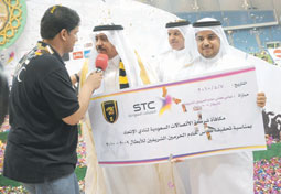 سلم مدير إدارة إستراتيجية التواصل وبناء الهوية بشركة الاتصالات السعودية المهندس حسين اليامي الرئيس الاتحادي الدكتور خالد المرزوقي المكافأة المالية بمناسبة فوز الاتحاد لأول مرة بلقب كأس خادم الحرمين الشريفين للأبطال وذلك عقب فوز العميد على الهلال بركلات الترجيح 5-4 في المباراة الختامية التي جمعت الفريقين على إستاد الملك فهد الدولي بالرياض.