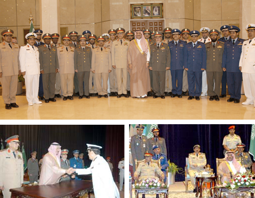نيابة عن صاحب السمو الملكي الأمير سلطان بن عبدالعزيز آل سعود ولي العهد نائب رئيس مجلس الوزراء وزير الدفاع والطيران والمفتش رعى صاحب السمو الملكي الأمير خالد بن سلطان بن عبدالعزيز مساعد وزير الدفاع والطيران والمفتش العام للشؤون العسكرية أمس حفل تخريج دورة الحرب الأولى من طلبة كلية القيادة والأركان للقوات المسلحة وذلك بمقر الكلية بالعيينة. وكان في استقباله لدى وصوله مقر الحفل معالي رئيس هيئة الأركان العامة الفريق أول ركن صالح بن على المحيا وقائد كلية القيادة والأركان للقوات المسلحة اللواء الركن محمد بن عوض بن سحيم. وفور وصول سموه عزف السلام الملكي. بعد ذلك صافح سموه كبار ضباط الكلية، ثم بدئ الحفل الخطابي المعد بهذه المناسبة بتلاوة آيات من القرآن الكريم. بعد ذلك ألقى قائد كلية القيادة والأركان اللواء محمد بن سحيم كلمة رحب فيها بسمو مساعد وزير الدفاع والطيران والمفتش العام للشؤون العسكرية والحضور. وأوضح أن الهدف من هذه الدورة هو تأهيل وإعداد نخبة من ضباط القوات المسلحة للقيام بالتخطيط وقيادة وإدارة العمليات العسكرية. وعد أمر خادم الحرمين الشريفين الملك عبدالله بن عبدالعزيز آل سعود بالبدء في إنشاء كلية حرب مكملاً لمنظومة التدريب في مسيرة التعليم العسكري، مشيراً إلى أنه تم البدء في التخطيط لتفعيل هذا التوجيه الكريم، عقب ذلك ألقيت كلمة الخريجين عبروا فيها عن مشاعر البهجة التي تغمرهم برعاية سمو الأمير خالد بن سلطان لحفل تخريج الدفعة الحرب الأولى من كلية القيادة والأركان للقوات المسلحة، ثم كرم صاحب السمو الملكي الأمير خالد بن سلطان بن عبدالعزيز خريجي الدورة وقام سموه بتسليم الهدايا على المكرمين، عقب ذلك تسلم سمو مساعد وزير الدفاع والطيران والمفتش العام للشؤون العسكرية هدية تذكارية من قائد الكلية، ثم التقطت الصور التذكارية لسموه مع الخريجين.
