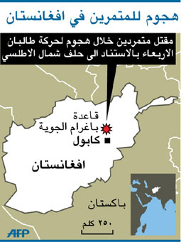 قتل سبعة عناصر من طالبان وأصيب خمسة من جنود حلف شمال الأطلسي ليلاً خلال معارك في قاعدة باغرام العسكرية التي تعتبر الأكبر في أفغانستان كما أعلنت قيادة الأطلسي صباح أمس الأربعاء مشيرة إلى أن المعارك مستمرة. وتبنت حركة طالبان مسؤولية الهجوم الذي شنه 20 انتحارياً من طالبان. وقال الحلف الأطلسي إن سبعة متمردين قتلوا في الهجوم المتواصل في باغرام موضحاً أن حركة طالبان تستخدم الصواريخ والقنابل والأسلحة الرشاشة. وأضافت قيادة الحلف أن خمسة جنود أصيبوا بجروح.