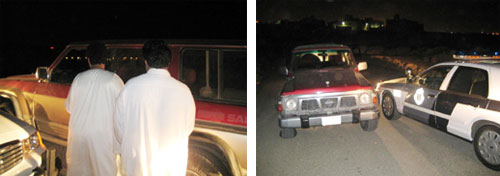 على الفور تم توجيه الفرق بسرعة القبض على السيارة والجناة وتم تطويق الحي بعدد من الفرق إضافة إلى ضابط المنطقة فتم تضييق الخناق على الجناة وإيقاف السيارة بالقوة بعدها تمكن الجناة من الهرب على الأقدام متجهين إلى أسفل الوادي للاختباء في المنطقة المظلمة..أفراد الدوريات تمكنوا من القبض على اثنين منهم داخل منطقة صخرية في الوادي فيما دل الجانيان المضبوطان على الجانيين اللذين تمكنا من الهرب وتم التحفظ على الجناة وباشرت الأدلة الجنائية رفع البصمات من السيارة المسروقة وتم الاتجاه لموقع الأسواق التي كان الجناة يقفون أمامها؛ حيث اتضح أنهم لم يتمكنوا من فتحها لسرعة ملاحظة الفرقة لوجود الأشخاص وإحباط عملية السرقة وتم التحفظ على الجناة وسلموا لمركز شرطة طويق .