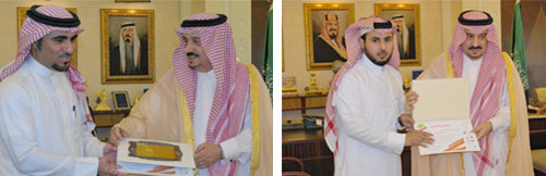 كرم صاحب السمو الملكي الأمير فيصل بن بندر بن عبد العزيز أمير منطقة القصيم بحضور صاحب الملكي الأمير الدكتور فيصل بن مشعل بن سعود بن عبد العزيز نائب أمير منطقة القصيم الزميل أحمد السالم والزميل غالب السهلي حيث تشرف الزميلان باستلام شهادة شكر وتقدير من يد سموه، وذلك مساء أمس بمكتبه بمقر ديوان الأمارة وذلك لجهودهم في مهرجان ربيع بريدة للعام المنصرم والتى كانت جريدة (الجزيرة) راعٍ إعلامي للمهرجان. هذا وقد عبر الزميلان عن بالغ شكرهما وتقديرهما لسموه الكريم وسمو نائبه مؤكدين في الوقت نفسه حصر جريدة الجزيره لمواكبة الأحداث وحضورها للمناشط الوطنية التى تخدم الوطن في كل محافله.