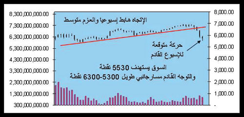 هبط خام نايمكس هذا الأسبوع إلى 67.5 دولار للبرميل وارتد نهاية الأسبوع إلى 70.7 دولار للبرميل كان الهبوط بدافع إفلاس بنك في إسبانيا وتخوف من عدة بنوك كبرى في أوروبا لكن كان الارتداد بسبب انخفاض مخزونات البترول في أمريكا وهبوط الأسهم إلى أسعار متدنية رفعت قليلاً من شهية المخاطرة لكنها خجولة، هذا من ناحية العوامل الخارجية التي هبطت بالسوق إلى 5750 نقطة كاسراً دعوم مهمة كثيرة تم بناؤها لعدة شهور تمكن صانع السوق من الفرار بأرباحه تاركاً ورائه ثقة مهزوزة وهلعاً كبيراً نتج عنه هبوط شركات لم تواكب الشركات القيادية وهبطت معها وبإغلاق السوق عند 5862 نقطة يظهر نمط بيعي قوي حصيلة شهر مايو الصعب والاتجاه أصبح هابطاً للأسبوع الثاني على التوالي والعزوم ممثلة بأحجام التداول بلغت 1.1 مليار سهم مجموع ما تم تداوله خلال الأسبوع وتظهر عزوماً متوسطة، وسابك والراجحي هما من وراء الهبوط الكبير، حيث بإغلاق الراجحي عند 74.5 ريال يسجل ثالث أسبوع على سلم الهبوط أما سابك بإغلاقها عند 80 ريالاً تسلك نفس السلوك، وواضح عملية الهروب من الشركات القيادية بشكل كبير.