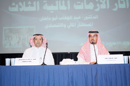 وركز المحاضر في لقائه على تأثير الأزمات الثلاث على سوق الأسهم السعودية وكيفية التعامل معها بحذر مع القراءة المستقبلية لآثار تلك الأزمات على السوق السعودية بوجه خاص وعموم الوحدة الخليجية بشكل عام من خلال تأثير الأزمات على بعض عملات الدول مثل اليورو والدولار مع تأثيرها الشديد على الصادرات والواردات وتأثيرها المباشر على عرض النقود وتذبذبها خلال الأعوام السابقة.