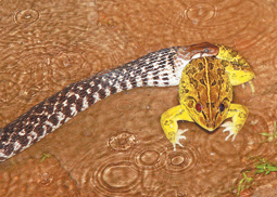 أفعى تأخذ وجبتها وتختارها هذه المرة لتكون ضفدعاً في بركة للماء المتجمع بعد هطول أمطار غزيرة جنوب الهند |