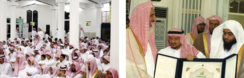 كرم سماحة الشيخ عبدالعزيز بن عبدالله آل الشيخ مفتي عام المملكة حفظة القرآن الكريم في مجمع الصفوة التعليمي لتحفيظ القرآن الكريم بجامع الشيخ سعد المقرن بالبديعة في حضور الشيخ سعد بن محمد آل فريان رئيس الجمعية الخيرية لتحفيظ القرآن الكريم بمنطقة الرياض. بدئ الحفل - بعد الترحيب- بنموذجين من تلاوات الطلاب، ثم ألقى د. عبدالرحمن الدخيل كلمة أولياء أمور الطلاب، أشار فيها إلى فضل حلقات تحفيظ القرآن الكريم على المجتمع وأثرها في حفظ الشباب ومحافظته على قيمه ونوه بجهود القائمين على مجمع الصفوة وعلى الجمعيات الخيرية لتحفيظ القرآن.بعد ذلك استمع الحضور إلى نماذج من تلاوات الطلاب، ثم نبذة تعريفية عن حلقة معاذ بن جبل لحفظ المتون العلمية التابعة للمجمع، مع نموذج من أحد طلابها، ثم أُلقيت كلمة المشرف التربوي بمجمع الصفوة فهد بن عبدالله النافع، الذي شكر في بدايتها رعاية الدولة لحفظة كتاب الله الكريم ولحلقات تحفيظ القرآن، ثم شكر جمعية تحفيظ القرآن الكريم بمنطقة الرياض، وخص مركز الغرب الذي يتبع له المجمع، وشكر سماحة المفتي العام على دعمه في تكريم وتشجيع حفظة القرآن الكريم.