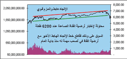 أول أسباب سلوك هذه الجلسة ارتداد لخام نايمكس إلى 75.5 دولاراً للبرميل واستقرار عند 74 دولاراً، وما حدث في عطلة نهاية الأسبوع هو انتشار إشاعة عالمية حول قيام الصين بإعادة النظر في أصولها المقومة باليورو، فهبطت الأسواق حينها هبوطاً قوياً، لكن سرعان ما نفت الصين هذه الإشاعة وارتدت ارتداداً مذهلاً للغاية. وواضح جداً أن المضاربين هم من يقود العالم الآن (مالياً). والنسبة القصوى لسابك هي جزء من سلسلة أحداث جنونية لم تقتصر على سابك فقط بل امتدت لكبرى الشركات العالمية المدرجة في الأسواق. لكن ثمة تحول مفاجئ في اهتمامات صناع الأسواق وهو التركيز حول مستقبل الديون السيادية والتي معظمها (سندات خزينة) مقومة بالدولار باعتها أمريكا على الصين مع بدء الأزمة المالية 2008م، وأخرى من منطقة اليورو مقومة باليورو وهي بوصلة الأسواق التي ستحدد اتجاهها ويبقى الأمر أحد أثمن أسرار رؤساء هذه الحكومات. أما بالنسبة لحركة التداول وبهذا الإغلاق في نمط شرائي قوي أغلق عند 6175 نقطة لا يزال الاتجاه هابطاً والعزم قوياً، وبعد أن دفع صانع السوق المؤشر العام نحو منطقة تقاطع وهي تقاطع وشيك لخط الاتجاه الهابط مع أرضية القناة الصاعدة الكبرى والموضحة بالرسم البياني باللونين الأحمر والأخضر يبدو أنه خلال الأيام القليلة القادمة سيتم جس نبض هذه القناة بمشاركة قوية قد تشهد تنشيطاً لمعظم محافظ المتعاملين.