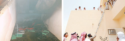 أصيب أربعة طلاب وإخلاء «300» طالب إثر نشوب حريق في إحدى مدارس ضرماء الثانوية، بسبب التماس كهربائي أشعل النيران في عدد من المراتب مما أدى إلى انتشار كمية كبيرة من الدخان داخل الفصول الدراسية، مما حدا بالطلاب للخروج والقفز عبر المنافذ.