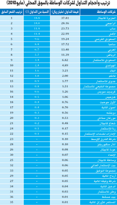 وكانت الجزيرة كابيتال قد تصدرت قائمة شركات الوساطة العاملة بالسوق المحلية لشهر مايو للمرة الثانية على التوالي بعد أن استعادت المركز من شركة الراجحي المالية والتي تصدرت القائمة خلال شهري فبراير ومارس من العام الجاري وبلغت قيم التداول الإجمالية لشهر مايو 201 مليار ريال كان نصيب الجزيرة منها 18.8% فيما كان المركز الثاني من نصيب الراجحي المالية والتي استحوذت على 14% من حجم التداولات وجاء ساب في المركز الثالث بنسبة 11.8% والأهلي في الرابع بنسبة 11.4% بينما لم تتعدى نسب الشركات الأخرى حاجز الـ10% حيث تراوحت بقية النسب بين 9.6% للسعودي الفرنسي و 0.01% لشركة المستثمر للأوراق المالية، وفيما يلي ترتيب شركات الوساطة العاملة بالسوق المحلي لشهر مايو 2010 موضحة في جدول، مع الإشارة إلى أن إجمالي قيم التداول تعادل ضعف القيم المعلنة من قبل تداول بسبب طريقة احتساب الأرقام، حيث إن شركات الوساطة تحصل على عمولة من المشتري والبائع لنفس الصفقة.