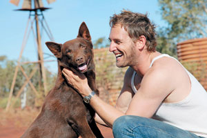 يداعب النجم السينمائي جوش لوكاس الكلبة النجمة (كوكو) خلال تصوير فيلم (الكلب الأحمر) (Red Dog) في دامبير سولت بإقليم بلبارا غرب أستراليا، ويدور حول الكلب الأحمر الأسطوري الأليف ذو اللون الخمري، حيث ساند الفيلم عدد من الشركات لبساطة تكاليفه