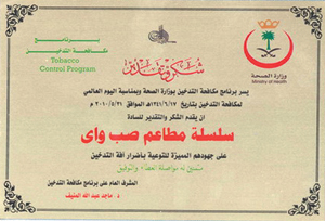 للعام الثاني على التوالي شاركت مطاعم «صب واي» وزارة الصحة ممثلة ببرنامج مكافحة التدخين بمناسبة اليوم العالمي للامتناع عن التدخين 31 مايو 2010 المقامة فعالياته على المستوى الوطني تحت شعار «التدخين وباء، دمر الرجال، ويستهدف اليوم النساء».
