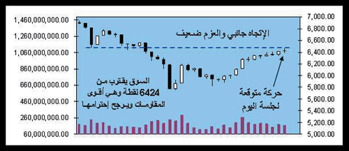 الاتجاه العام للسوق هابط لم يتغير شيء والمؤشر العام يتحرك تحت متوسط التداول ويخلو من السيولة الاستثمارية وفي مثل هذه الظروف وبناء على أحداث سابقة يكون الوقت كفيل بإزاحة هذه الغمامة والأفضل التعامل مع السوق بنفس قصير حتى يثبت العكس، وبعد دمج حركة التداول لآخر 36 جلسة يرجح أن يغلق السوق عند 6424 نقطة وبأحجام تداول تبلغ 160 مليون سهم.