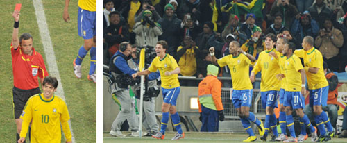 وتلقى كاكا إنذارين في آخر خمس دقائق ليخرج مطرودا ويتأكد غيابه عن مواجهة البرتغال في الجولة الثالثة والأخيرة في دور المجموعات.
