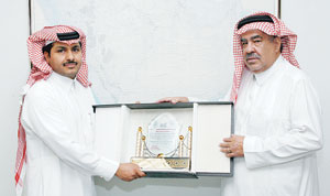 نيابة عن رئيس مجلس إدارة الجعية الجغرافية السعودية الأستاذ الدكتور محمد شوقي مكي وأعضائها ومنسوبيها قدم الأستاذ عيد العنزي مسؤول العلاقات العامة والإعلام بالجمعية درعاً تكريمياً لسعادة الأستاذ جاسر بن عبدالعزيز الجاسر مدير التحرير للشؤون السياسية بصحيفة الجزيرة وذلك للجهود المباركة والتعاون الملموس مع الجمعية من خلال الدعم الإعلامي الجيد عبر هذه الصحيفة الموقرة الذي كان له الأثر الطيب في تطور اللجان الإعلامية بالجمعية.