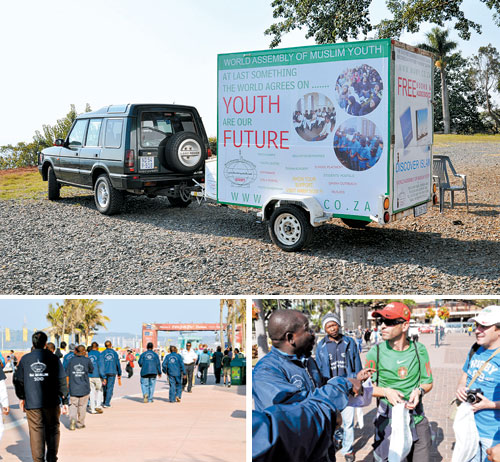 أطلقت الندوة العالمية للشباب الإسلامي عربة توعوية متنقلة تجوب المناطق المجاورة للملاعب التي تقام عليها مباريات بطولة كأس العالم في جنوب إفريقيا وتحمل العربة التي تجوب الملاعب مطبوعات وكتيبات وأسطوانات أفلام تعريفية عن الإسلام بلغات عالمية مختلفة وساهمت الفرق الشبابية التابعة للندوة والبالغ عددهم 50 شابا في توزيع المطبوعات التوعوية على جماهير المنتخبات ورواد الملاعب على فترتين صباحية ومسائية وشاركت بفاعلية في مباراة البرازيل والبرتغال والتي شهدت حضوراً جماهيرياً كبيراً، وأكد الدكتور منير بن خالد الحميد الأمين العام المساعد للتخطيط والتنمية في الندوة العالمية للشباب الإسلامي والمشرف على برنامج الندوة في المونديال: إن البرنامج التوعوي (اكتشف الإسلام) في بطولة كأس العالم التاسعة عشرة التي تحتضنها جنوب إفريقيا حقق نجاحا فاعلا وحظي بصدى كبير من الجماهير والزوار، لافتا إلى أن توزيع المطبوعات والهدايا شمل الميادين والساحات العامة وقرب الشاطئ والأسواق والأماكن التي تكتظ فيها التجمعات الشبابية ومشجعي المنتخبات.