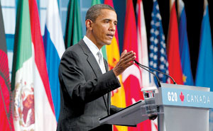 أعلن الرئيس الأمريكي باراك أوباما أن الولايات المتحدة التي تثقلها الديون لا يمكنها «الاقتراض أو الدفع» لضمان الازدهار العالمي، محذراً من الصادرات إلى بلاده لا يمكن أن تستخدم لتسديد تكاليف الانتعاش الاقتصادي العالمي. وقال أوباما في ختام قمة مجموعة العشرين التي ركزت على تعزيز الانتعاش الاقتصاد العالمي الهش أنه «وبعد سنوات من الاقتراض الزائد، الولايات المتحدة غير قادرة ولن تقترض أو تدفع لضمان الازدهار العالمي». وأضاف أوباما «يجب ألا تفترض أي دولة أن طريقها نحو الازدهار هو من خلال التصدير إلى الولايات المتحدة. بالفعل، لقد أوضحت أن الولايات المتحدة ستنافس بقوة على الوظائف والصناعات والأسواق في المستقبل».