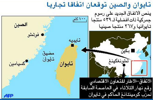 وقَّعت تايوان والصين أمس الثلاثاء اتفاقاً تجارياً وصف بأنه تاريخي يقرِّب بين الصين القارية والجزيرة التي انفصلت عنها منذ ستين عاماً، وقد أثار تنديداً في تايوان. ومن شأن الاتفاق - الإطار للتعاون الاقتصادي الذي وقِّع بالأحرف الأولى في تشونغكينغ المدينة الكبرى في جنوب غرب الصين أن يفتح مجالات كبرى من الفرص التجارية المكبلة حالياً بالقواعد والقوانين المفروضة. غير أن البعض في تايوان أبدى خشيته من أن يسمح هذا التقارب للصين ببسط هيمنتها السياسية تدريجياً على الجزيرة التي تعتبرها إقليماً متمرداً من أقاليمها. وقال يانغ يونغ مينغ الخبير السياسي في جامعة سوتشوو في تايبيه إن «هذا قد يقرِّب الجزيرة خطوة من القارة.. ومع زيادة تبعية تايبيه الاقتصادية بشكل تدريجي، تتقلّص خياراتها السياسية». وانفصلت تايوان عن الصين منذ وصول الشيوعيين إلى السلطة في بكين عام 1949 ولو أن بكين تعلن عزمها على استعادة السيطرة عليها ولو بالقوة إن اقتضى الأمر. وشهدت العلاقات الثنائية تحسناً كبيراً منذ وصول ما ينغ جيو إلى السلطة في تايوان عام 2008 وهو يؤيِّد التقرّب من بكين، مثيراً بذلك انتقادات المسؤولين التايوانيين. وقال موفد تايوان تشيانغ بين كونغ لدى وصوله الاثنين إلى تشونغكينغ «لقد سمحنا بتطور سلمي بين الطرفين». وأضاف «إن توتر الماضي تحول إلى سلام، المواجهة أضحت تعاوناً». وينص الاتفاق - الإطار للتعاون الاقتصادي على رسوم جمركية ذات أفضلية وصولاً إلى إلغاء الرسوم الجمركية على 539 منتجاً تايوانياً تتراوح من الصناعات البتروكيميائية إلى قطع السيارات وتشكل 16% من صادرات الجزيرة إلى الصين.