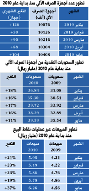 أظهرت البيانات الشهرية التي تصدرها مؤسسة النقد السعودي، ارتفاعاً في قيمة السحوبات النقدية من أجهزة الصرف الآلي عبر المملكة في شهر مايو 2010 إلى حوالي 39.6 مليار ريال وبنسبة ارتفاع قدرها 11% مقارنة بشهر مايو 2009م، وتمت هذه السحوبات عبر أكثر من 10.4 ألف جهاز صرف آلي للمصارف