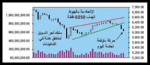 شهدت سوق الأسهم المحلية ضغطا جماعيا من معظم القطاعات والأسهم القيادية خصوصا (السعودي الفرنسي - سابك - كيان - الكهرباء) ومزيدا من التقدم في المسار الهابط، بعد أن كان المؤشر العام قد أعطى إشارات قوية باستعداده لاستئناف المسار الهابط العام كما كان متوقعاً في التقارير الأخيرة، وبالتركيز على سابك صاحبة الثقل الأكبر في السوق دخلت منطقة الثمانينات ولم تسعفها القشة التي تعلقت بها في منطقة التسعينات، والآن بدأت مسارا هابطا أقوى ولديها دعوم ضعيفة منها 84 ريالا (لا يعتد بها) بسبب أن أحجام التداول مع الهبوط أعلى منه مع الصعود، وتعتبر أخطر القطاعات في الأيام القليلة المقبلة (البتروكيماويات - التأمين) والأخير يشهد عمليات مضاربية سريعة لا تتعدى 4 جلسات حمراء وخضراء لكن مسارها العام هابط في النهاية، وبإغلاق السوق عند 6135 نقطة دخل فعليا في الاتجاه الهابط، أما العزوم فبلغت 163 مليون سهم وتصنف بالقوية وهناك فرق بين تناقص أحجام التداول في الجلسات الأربع الأخيرة دون 130 مليون سهم وبين تداول هذه الجلسة التي نمت كمياتها مع الهبوط دليل أن الأيام الأخيرة كانت مرحلة تثبيت لمزيد من التصريف وتم التنويه إلى ذلك.