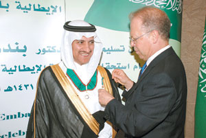 وقد قام السفير الإيطالي بالمملكة السيد أويجنيو داوريا بتقليد معاليه الوسام، مبديا تقدير وتثمين الحكومة الإيطالية لجهود معاليه التي أسهمت بشكل مباشر في تنمية العلاقات التي تربط البلدين والشعبين الصديقين على المستويات كافة. وأضاف أن هذا الوسام يُعتبر من أرفع الأوسمة الإيطالية ويرجع تاريخه إلى عائلة السافوي الملكية. وأضاف السفير الإيطالي أن هذا الوسام صدر بمرسوم موقّع من كل من فخامة رئيس الجمهورية الإيطالية جورجيو نابوليتانو ودولة رئيس الوزراء الإيطالي سيلفيو بيرلوسكوني.