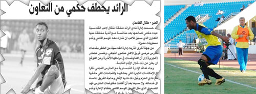 (الجزيرة) أجرت اتصالاً برئيس الرائد فهد المطوع، الذي شدد على أنهم قطعوا مرحلة متقدمة من المفاوضات، ولم يتبق سوى التوقيع النهائي، بعد أن قدموا عرضهم لإدارة القادسية بطلب اللاعب موسما واحدا بعد فشل انتقال صفقة يوسف الموينع من الأهلي. وأشار في حديثه إلى أنهم لم يعلموا بمفاوضات التعاون لحكمي إلا من خلال اتصالات من منسوبي التعاون، مبيناً أن الفيصل في ذلك هو اللاعب نفسه؛ حيث سيتحدث معه بشأن المفاوضات التعاونية. مؤكداً أنه سيصرف النظر عن ضم اللاعب إذا ثبت أن هناك اتفاقا بين اللاعب والتعاون، مشيراً إلى أنه يقدر رجالات التعاون، ولن يدخل في مزايدات من شأنها أن تعكر التنافس الشريف بين الناديين داخل المستطيل الأخضر.