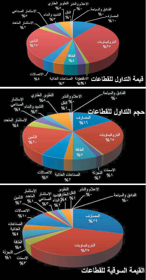 بلغت القيم المتداولة الأسبوع الماضي 14.5 مليار ريال وبلغ حجم الأسهم المتداولة خلال الأسبوع 666.8 مليون سهم, نفذت هذه الأحجام والقيم من خلال 429.6 ألف صفقة. ومن خلال القيم المتداولة في السوق نجد أن متوسط القيمة المتداولة يوميا تراجع إلى 2.9 مليار ريال في إشارة إلى تراجع الزخم في السوق وقد تراجعت متوسط قيمة الصفقة الواحدة إلى 34 ألف ريال للصفقة الواحدة استحوذت ثلاث قطاعات من أصل خمسة عشر قطاعا مدرجة في السوق على 61.35% من إجمالي أحجام الأسهم المتداولة وهي قطاع الصناعات البتروكيماوية الذي جاء على رأس قائمة القطاعات النشطة بالكمية بعد أن استحوذ على 24.88% ما يمثل تداول 165.9 مليون سهم, يليه قطاع التأمين الذي استحوذ على 20.15% بحجم تداول بلغ 134.3 مليونا وثالث القطاعات النشطة كان قطاع المصارف والخدمات المالية الذي استحوذ على 16.32% ممثلا حجم تداول بلغ 108.8 مليون سهم. وبالنظر إلى نشاط الأسهم المدرجة في السوق السعودية فقد استحوذ سهم مصرف الإنماء على 15.12% من إجمالي كميات الأسهم المتداولة في السوق بعد أن تجاوز حجم الأسهم المدورة في المصرف 100.8 مليون سهم وتلاه سهم كيان السعودية الذي استحوذ على 9.8% بعد أن بلغ حجم التداول في السهم 65.5 مليون سهم, وثالث الأسهم النشطين سهم الكهرباء السعودية الذي استحوذ على 6.6% بعد أن بلغ حجم التداول الأسبوعي في السهم 43.8 مليون سهم. وبالانتقال إلى قائمة الأسهم الأكثر نشاطا بالقيمة فقد استحوذ سهم سابك على 13.7% بعد أن تجاوزت القيمة المتداولة في السهم ملياري ريال سعودي, وتلاه كيان السعودية الذي تداول 1.2 مليار ريال مستحوذا على 8.3%, وثالث الأسهم نشاطا بالقيمة كان سهم مصرف الإنماء الذي استحوذ على 7.7% بعد أن بلغت القيمة المتداولة في المصرف 1.1 مليار ريال.