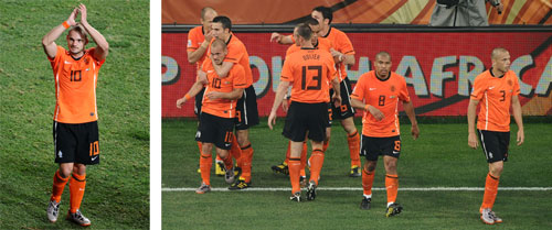 أكد لاعب وسط منتخب هولندا لكرة القدم ويسلي سنايدر أن «إقصاء اكبر وأفضل المنتخبات العالمية شعور رائع» في إشارة إلى فوز منتخب بلاده على البرازيل 2 - 1 في الدور ربع النهائي لنهائيات كأس العالم المقامة حالياً في جنوب إفريقيا. وقال سنايدر الذي اختير أفضل لاعب في المباراة: «أشعر بشعور رائع بعدما نجحنا في إقصاء اكبر وأفضل المنتخبات العالمية، نحن دائماً نسجل أهدافا. قمنا بعمل رائع. صحيح إننا أقصينا البرازيل، لكن الأمر المهم هو أننا في نصف النهائي»، مضيفا «يجب أن نستمتع باللحظة ونحتفل بهذا الانتصار، وأضاف سنايدر الذي كان وراء الهدف الأول لمنتخب بلاده عندما مرر كرة عرضية تابعها فيليبو ميلو بالخطأ في مرمى جوليو سيزار: «كنا نعرف قبل بداية المباراة إنها ستكون مثيرة، وكانت كذلك. في نهاية المطاف حققنا الفوز ونحن سعداء بذلك بطبيعة الحال». وتابع «أنا سعيد بجائزة أفضل لاعب في المباراة لكن الإنجاز كان جماعيا بفضل لاعبي المنتخب دون استثناء. الشوط الأول كان صعبا جدا وأنقذنا مارتن ستيكيلنبرغ من هدف ثان بتصديه ببراعة لتسديدة كاكا. قررنا تحسين مستوانا في الشوط الثاني ومضاعفة الضغط على الدفاع البرازيلي. كان يتعين علينا الاستمرار في الثقة بقدرتنا على العودة في نتيجة المباراة وكان الأمر كذلك ونجحنا في تحقيق الفوز».